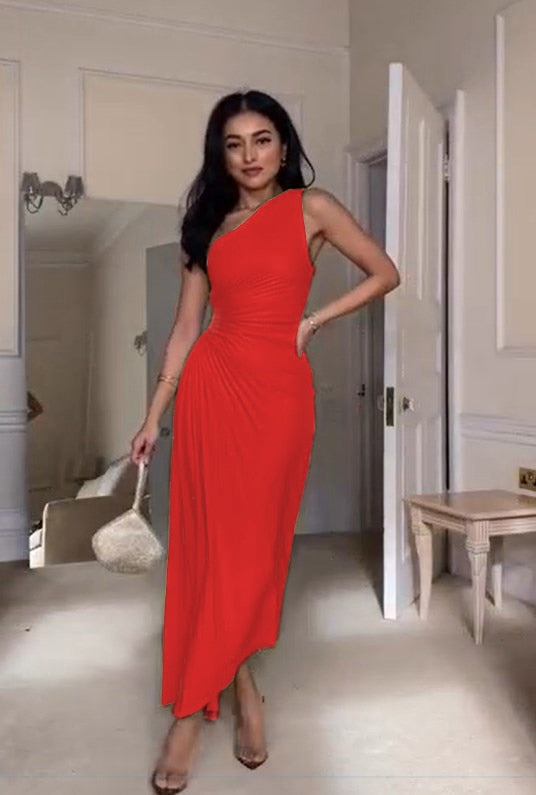 Introducing the all-new One Shoulder Pleated Maxi Dress, perfect for adding a touch of modern sophistication to your wardrobe. Crafted from an ultra-soft and lightweight synthetic fiber material, this floor-length dress is designed to be both comfortable and chic. Featuring an eye-catching asymmetrical design with a diagonal collar and single shoulder pleats that flow gracefully downwards, you'll love the way this dress looks and feels. The slim fit silhouette gives it a touch of sultriness that is perfect for any occasion. From date nights to cocktails events and everything in between, the One Shoulder Pleated Maxi Dress is sure to become one of your favorite wardrobe go-tos. With its subtle stretch fabrication construction, this dress will hug your curves perfectly without being overly constrictive. Get ready to take center stage in summer 2023 when you put on the One Shoulder Pleated Maxi Dress at your next special event!